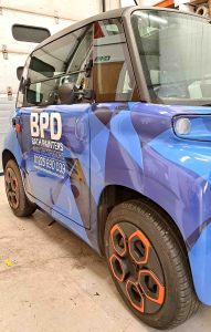 The customer required a Citroen Ami to be wrapped with its branding and contact information to help promote the business while the vehicle was out and about on the roads of Bath.