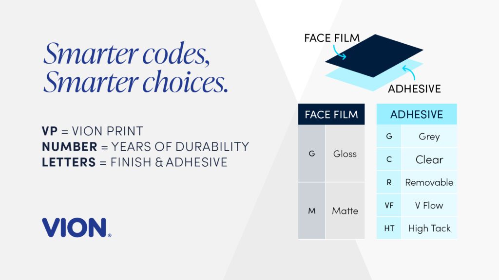 VP (VION Print) + Years of durability + Face finish + Adhesive type